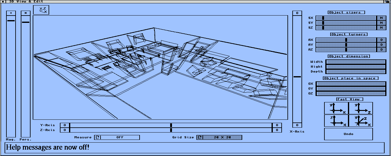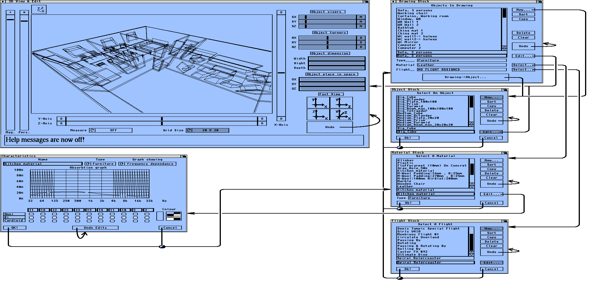 This window is handling the virtual audio environment pure visually. The main modeling work is done here and it is from this stage the most of The Log is formed, along with the material and flight-paths used.