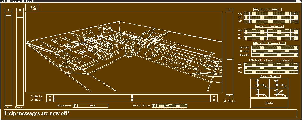 Questo slider gestisce il fattore focale della lente di visualizzazione. Spostando la manopola verso l'alto si riduce il fattore focale (aumenta il fattore prospettico). Il controllo "*" è un interruttore per la prospettiva. È piuttosto conveniente disattivare la prospettiva durante la modellazione.