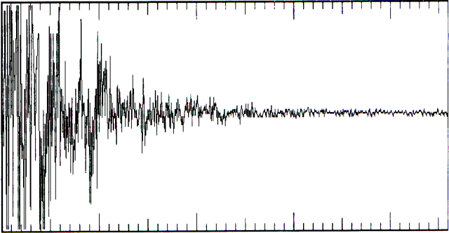 Möjligt impulssvar från ett rum. Td är direktljudet och Tr är efterklangens inträdande vilket är en suddig gräns, och är efterklangstiden (reverberationstiden). Se bilaga B för formler.